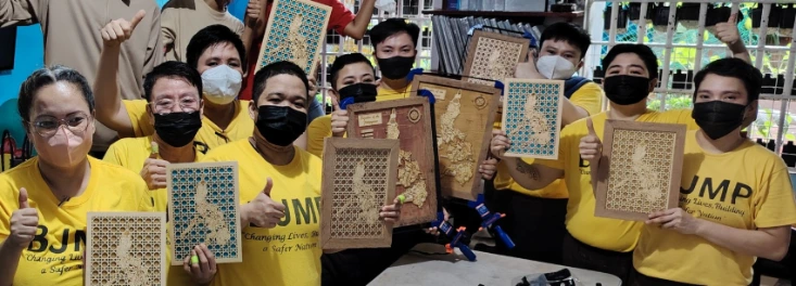 BJMP Santa Rosa Laguna (Female Dorm): Residents are involved in sanding and assembling wooden maps and coloring coconut shells.